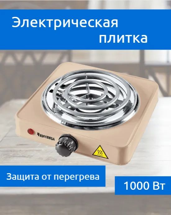 Плитка электрическая мощностью 1000Вт с одной спиральной конфоркой. В данном устройстве появился поворотный переключатель, с помощью которого вы сможете подобрать одну из пяти мощностей нагрева электрической плитки. Благодаря технологии защитного отключения полностью исключен риск перегрева прибора, что значительно увеличивает его эксплуатационный период. Рабочая поверхность электрической плитки покрыта качественной эмалью, на очистку которой от накопившихся загрязнений вы потратите не более нескольких минут.
