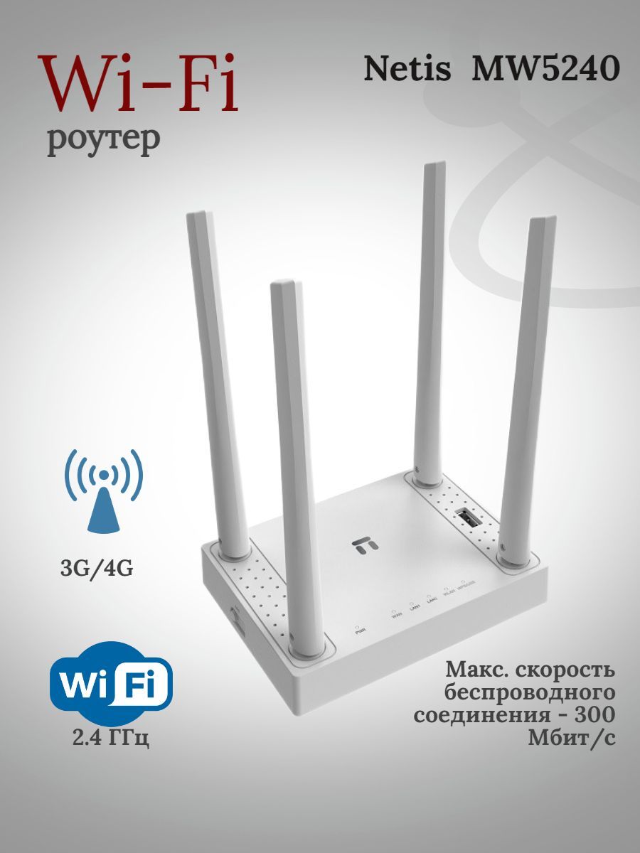Wi-Fi роутер netis MW5240 оснащен четырьмя внешними антеннами с коэффициентом усиления антенн - 5 дБи. Устройство осуществляет вещание Wi-Fi в диапазоне 2,4Ггц. Максимальная скорость соединения по Wi-Fi составляет до 300 Мбит/с и подходит для загрузки файлов, Internet -звонков и онлайн просмотра HD видео. Роутер netis MW5240 поддерживает подключение к USB 3G/4G LTE модемам. Список совместимых 3G/4G модемов можете найти на официальном сайте производителя. Благодаря возможности подключения USB-модемов, вы можете иметь резервный канал доступа к сети интернет, так как роутер может автоматически переключаться с проводного подключения интернет на LTE и обратно. Помимо этого, Вы можете подключить накопительное устройство USB через порт USB2.0 для отправки файлов, воспроизведения медиаматериалов и настройки сервера FTP. netis MW5240 поддерживает TR-069, а так же современный стандарт IPv6. В роутере реализована функция онлайн обновления прошивки, для поддержания актуальной версии встроенного программного обеспечения устройства. Данный роутер подходит для тарифов интернет-провайдера до 100 Мбит/с.