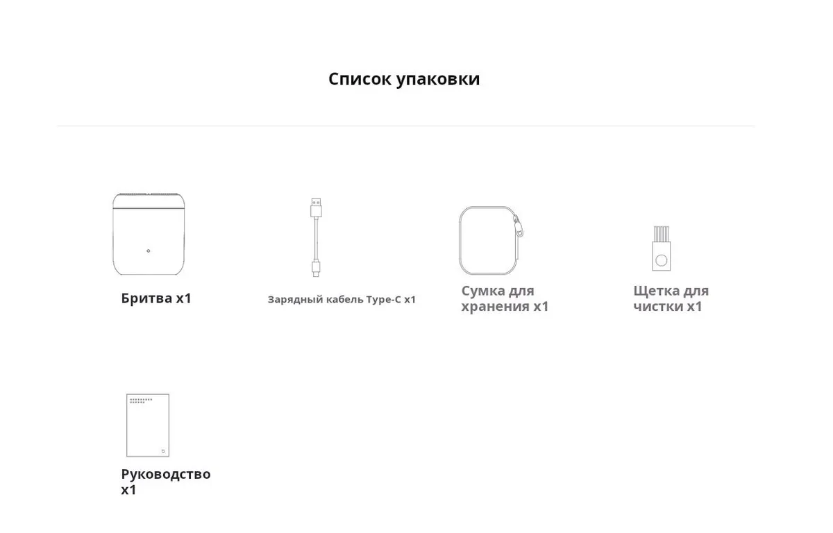 Нож для бритвы*1Зарядка кабеля*1Сумка для хранения*1Руководство*1Чистая щетка*1