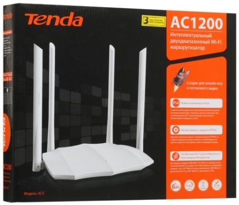 Интеллектуальный двухдиапазонный Wi-Fi роутер Tenda AC5 V3.0 (AC1200) белый AC5 — это двухдиапазонный WiFi-маршрутизатор AC1200, разработанный для квартир среднего размера с оптоволоконным доступом 100 Мбит / с. Он обеспечивает скорость Wi-Fi до 1167 Мбит / с (5 ГГц: 867 Мбит / с и 2,4 ГГц: 300 Мбит / с). Принята интегрированная двухдиапазонная технология, объединяющая сигналы 2,4 ГГц и 5 ГГц под одним именем WiFi. Более быстрая полоса будет автоматически выделена вашим устройствам нашей системой динамической оптимизации. Между тем, оснащенный антеннами с высоким коэффициентом усиления 4 * 6 dBi и 28-нм высокопроизводительным процессором, он обеспечивает лучший опыт работы в Интернете. AC5 поддерживает протокол IPv6, это позволяет сократить время передачи данных и минимизировать задержку. Кроме того, функция удаленного управления приложением Tenda WiFi обеспечивает самый простой способ управления AC5.