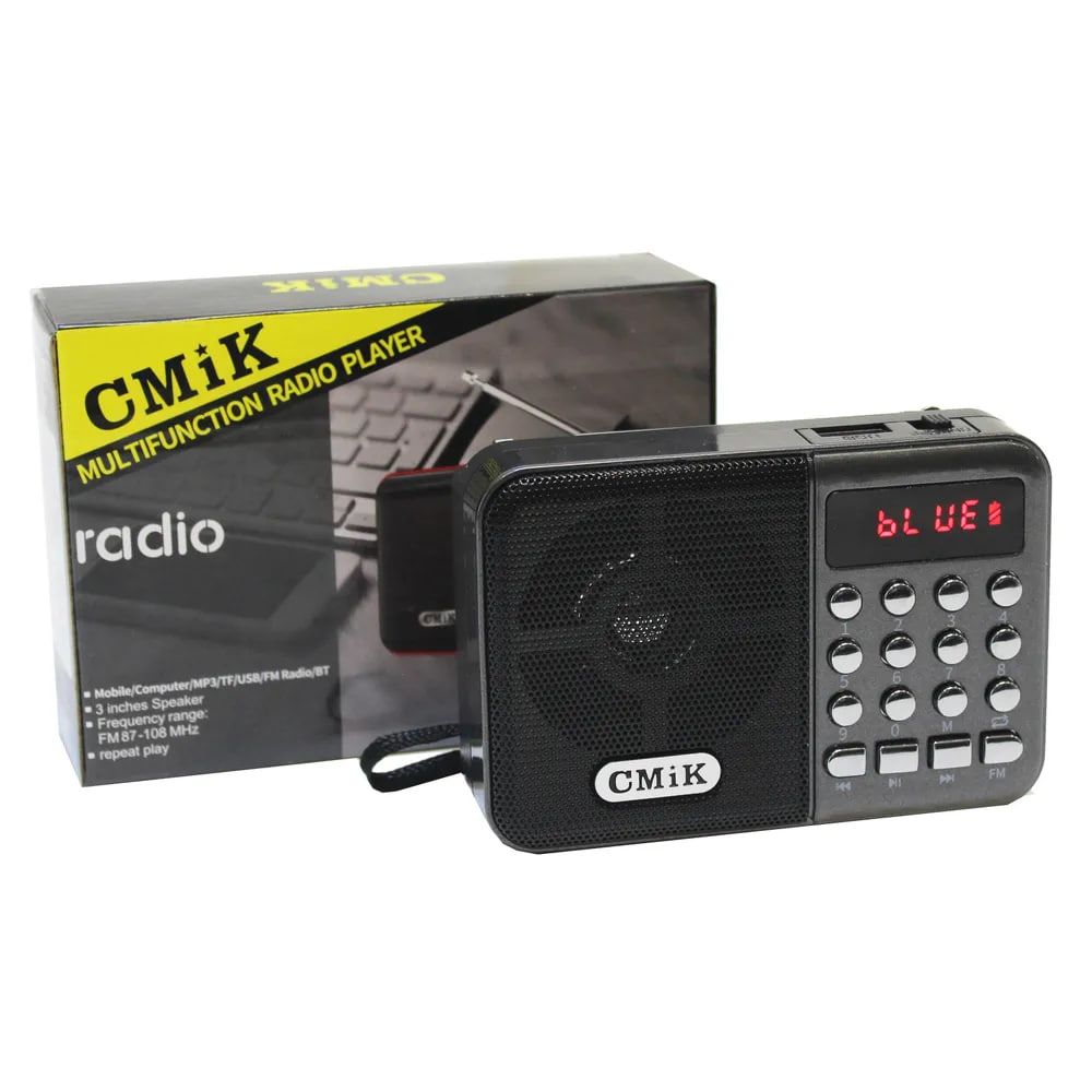 Компактный цифровой Bluetooth радиоприемник CMiK MK-066 с mp3-проигрывателем, сменным аккумулятором, LED дисплеем с индикатором заряда батареи и громким динамиком.