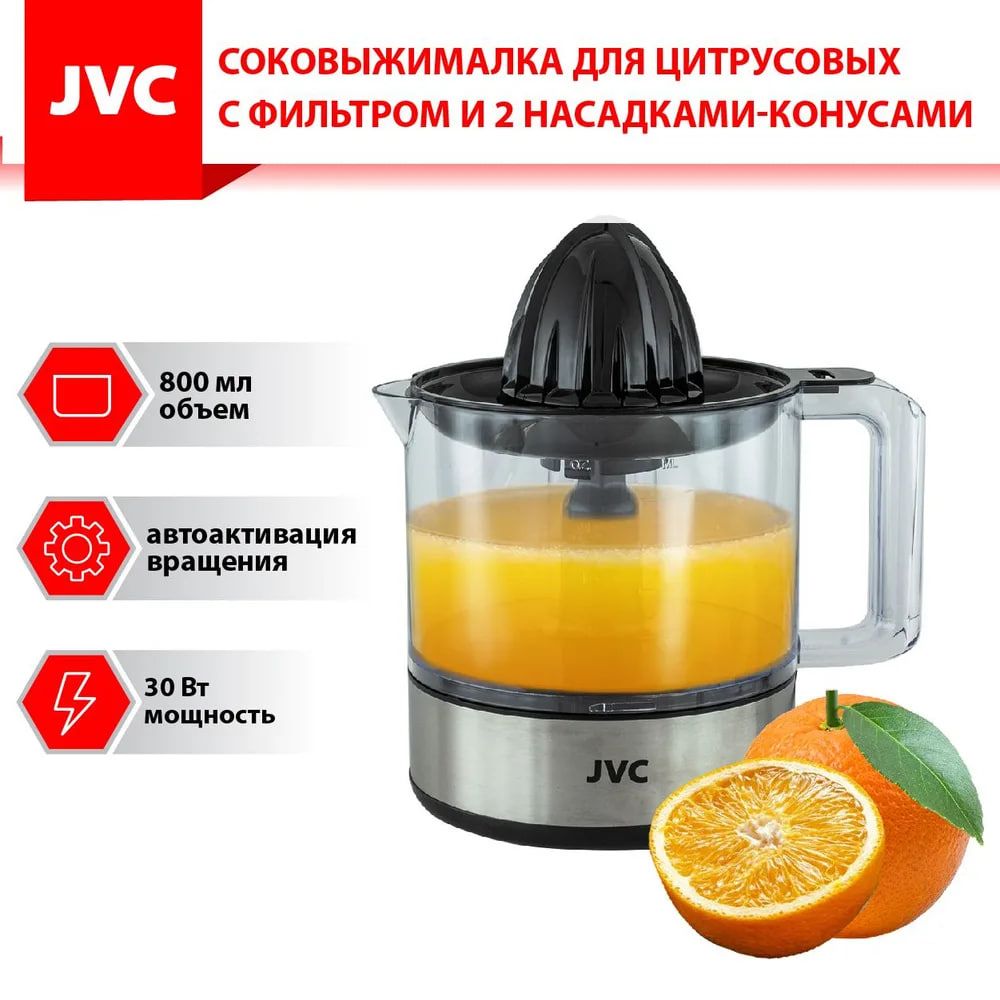 Соковыжималка для цитрусовых электрическая JVC JK-JC2010 с 2 насадками для фруктов разного размера и фильтром позволит получить большой объем чистого сока всего за несколько минут.