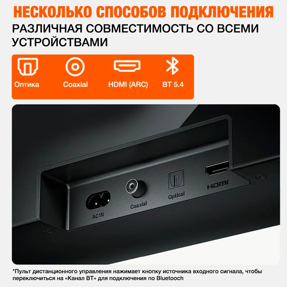 Саундбар поддерживает разные типы, как проводного, так и беспроводного подключения