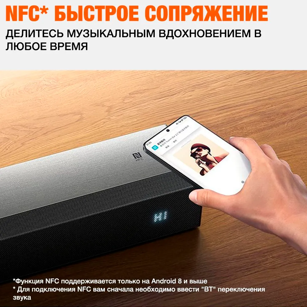 к гаджетам в ОДНО КАСАНИЕ!Благодаря наличию NFC области на саундбаре можно установить Bluetooth-соединение со смартфоном в одно касание.