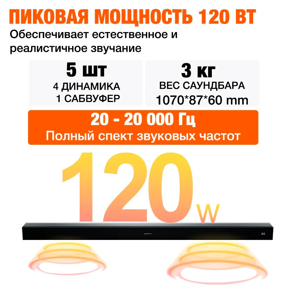 МОЩНОСТЬ 120 ВтВнутри саундбара Xiaomi находятся два высокочастотных динамика, два среднечастотных и 1 сабвуфер суммарной мощностью 120 Ватт.