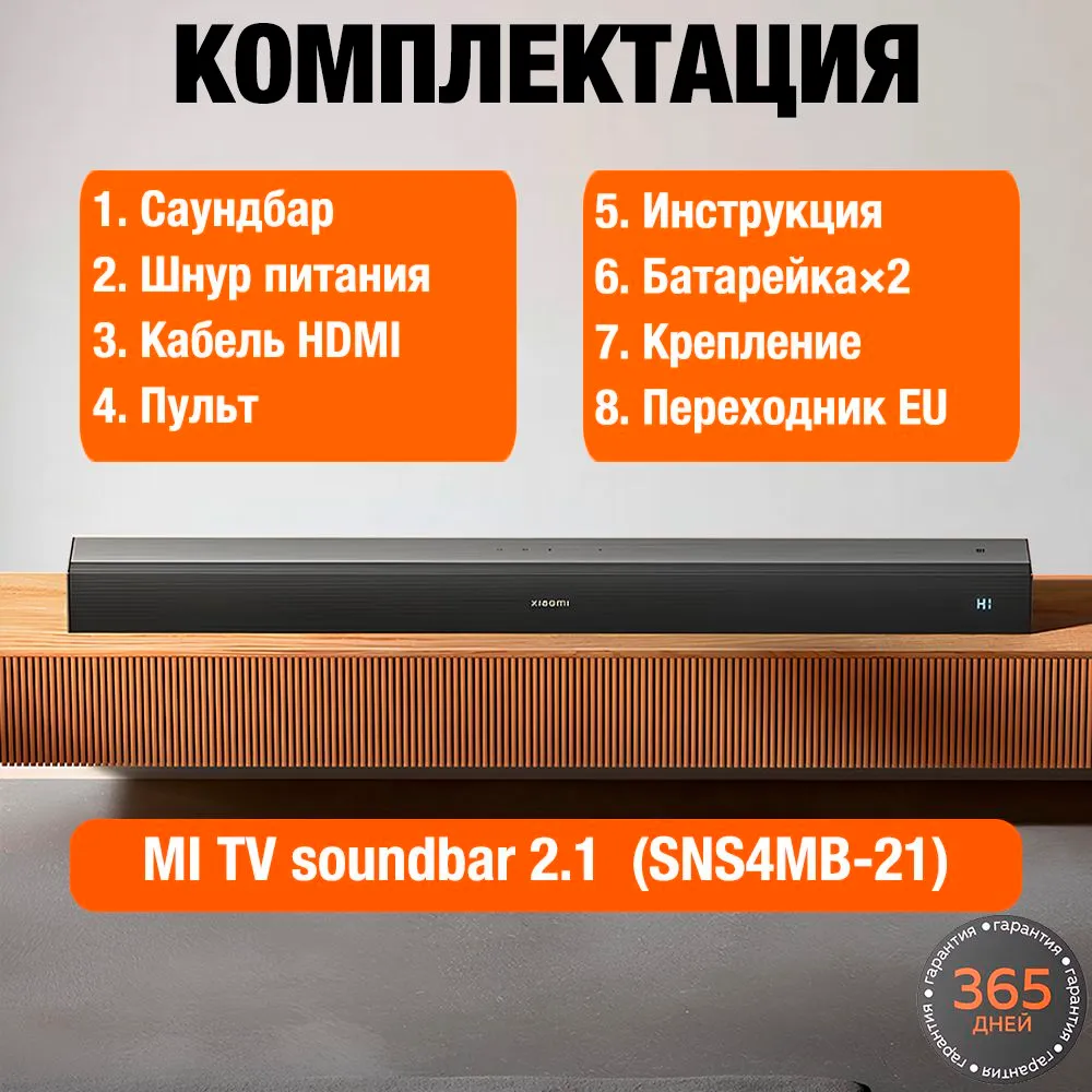 Саундбар Xiaomi MI TV Soundbar 2.1 (SNS4MB-21), Пульт ДУ, Шнур питания+переходник, Кабель HDMI, Настенное крепление, Инструкция, 2 батарейки, Гарантийный талон