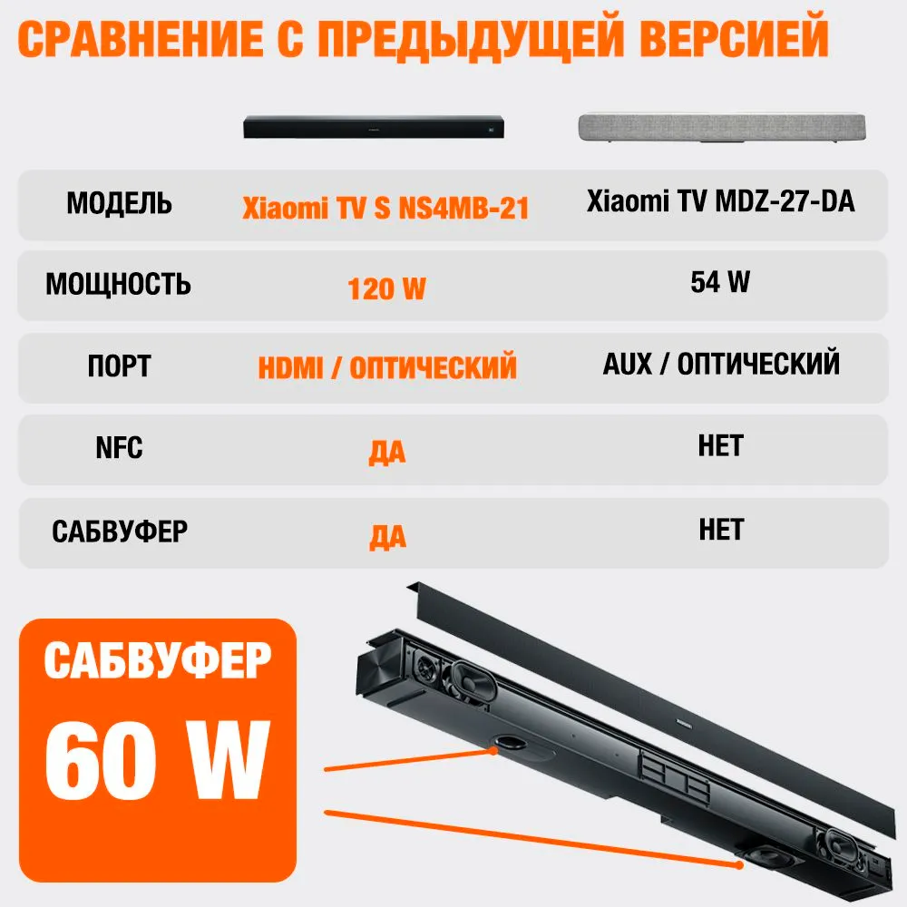 Сравнение Саундбара Xiaomi TV 2.1 (SNS4MB-21)В отличие от моделей Xiaomi Mi TV Soundbar MDZ-27-DA и модели Xiaomi Redmi TV Soundbar, данная модель получила более мощные динамики - 120W , HDMI выход, Последнюю версию Bluetooth, NFC Сопряжение и встроенный САБВУФЕР