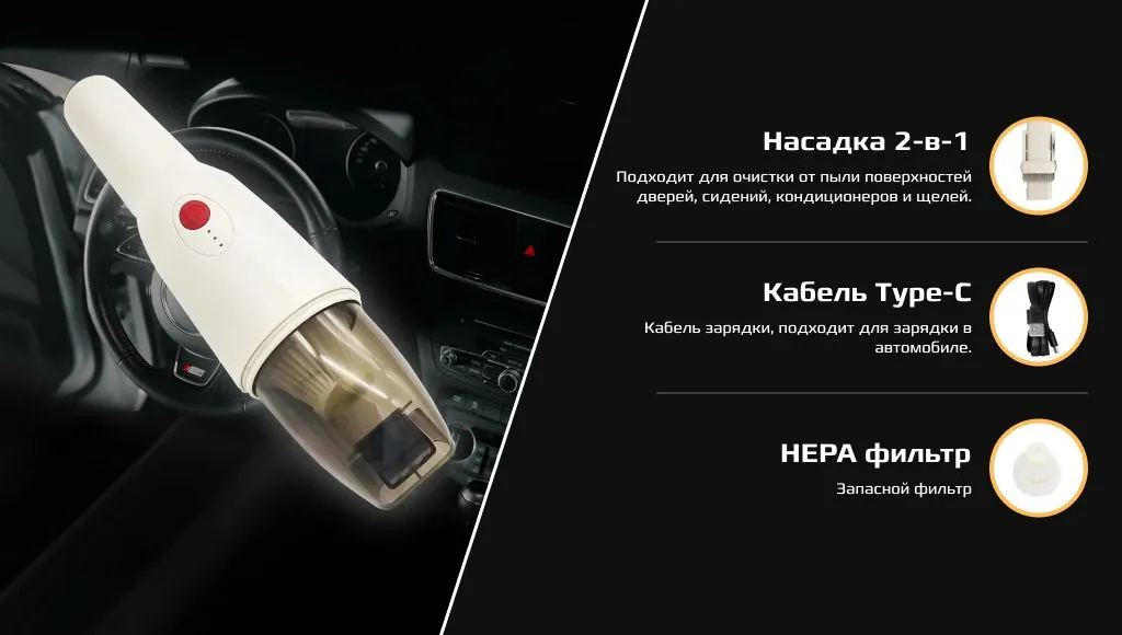 УниверсальностьИспользуйте и дома, и в автомобиле. Насадка 2-в-1 поможет эффективно справиться с труднодоступными загрязнениями, пылью, сажей и шерстью. Зарядный кабель с USB-A и Type-C интерфейсами удобен для зарядки устройства внутри автомобиля.