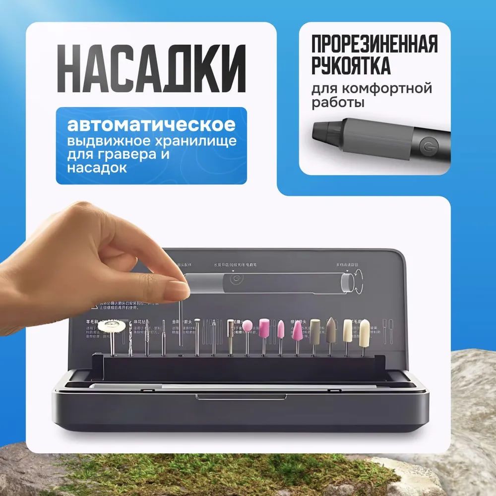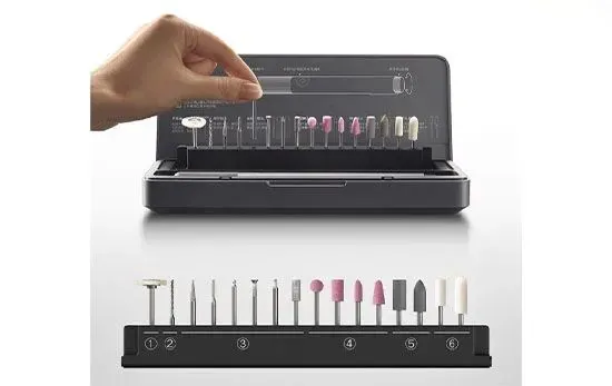 Двигатель и питаниеБесщеточный двигатель обеспечивает скорость 15000-22000 об/мин. Прибор работает от аккумулятора и от сети. Аккумулятор емкостью 800 мАч полностью заряжается за 90 минут, обеспечивая достаточно времени для выполнения работы.Выдвижной органайзерОрганайзер из прочного ABS-пластика имеет автоматическое выдвижное хранилище и содержит 16 высококачественных шлифовальных насадок: шерстяная щетка - 1 шт, спиральное сверло - 1 шт, алмазная шлифовальная насадка - 6 шт, шлифовальная насадка - 4 шт, резиновая шлифовальная насадка - 2 шт, шлифовальная насадка из шерсти - 2 шт.