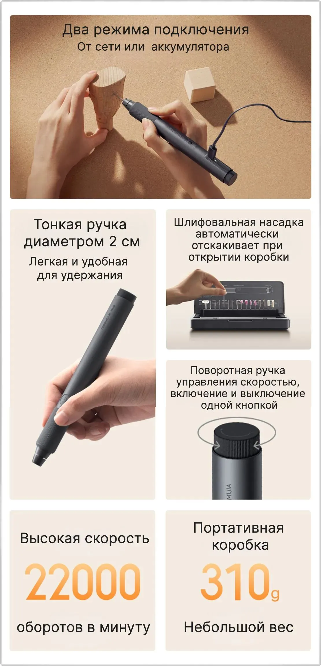 Функциональные возможностиЭлектрическая шлифовальная машина с различными насадками может выполнять такие операции, как: гравировку по дереву, шлифовку дерева и металла, прокалывание кулонов, полировку нефрита, серебра и т. д.Гравер Mi Home Appliances Sharpening Pen MJDMB001QW – это компактный и мощный электрический гравер, который станет незаменимым помощником для творчества, ремонта и заточки. Этот аккумуляторный инструмент сочетает в себе высокую производительность и удобство использования.