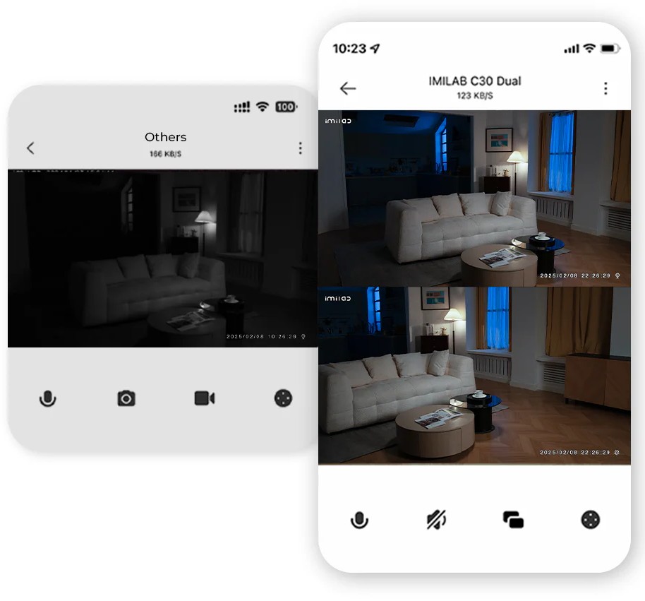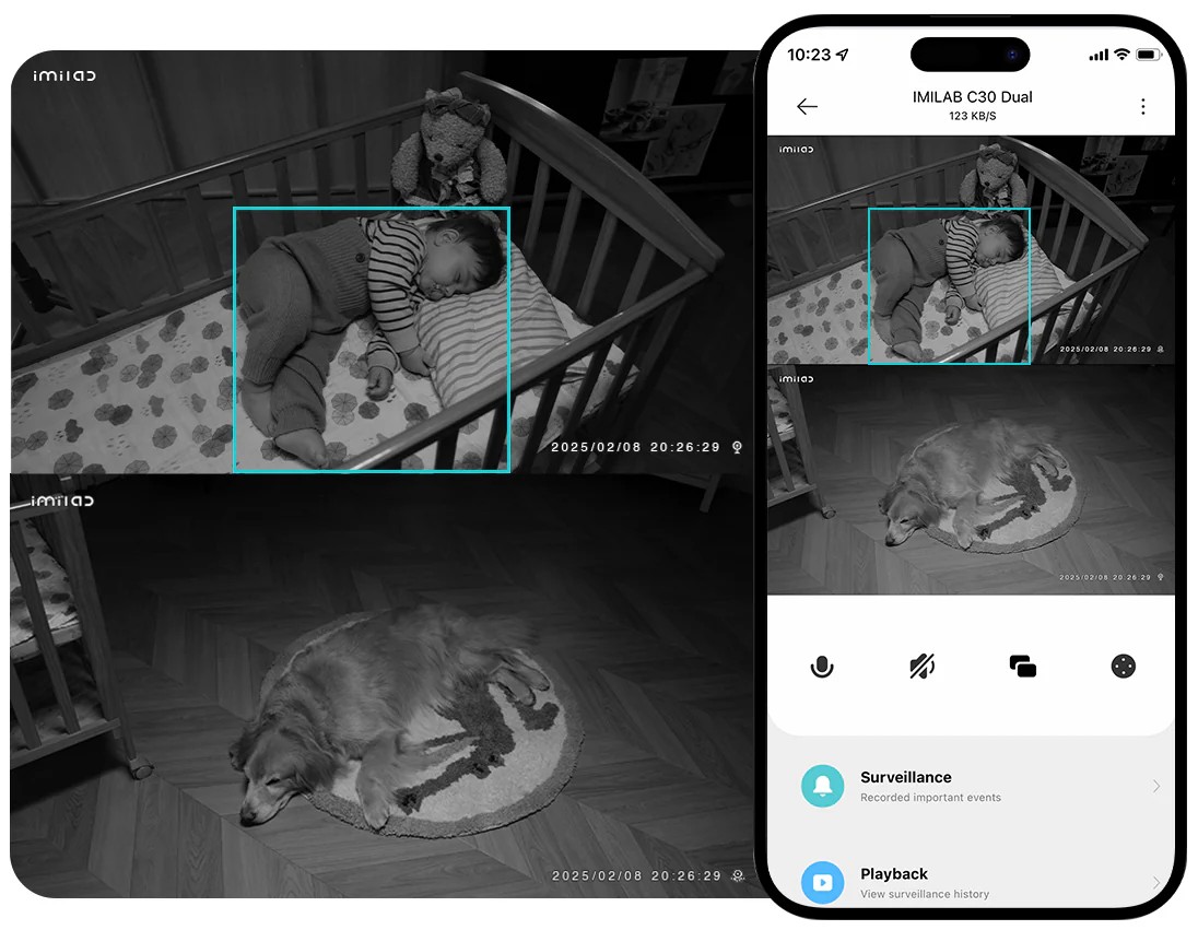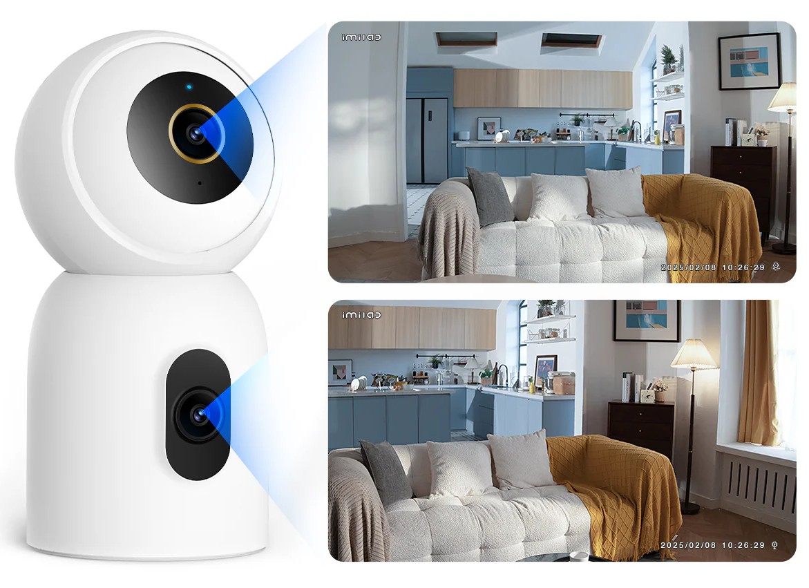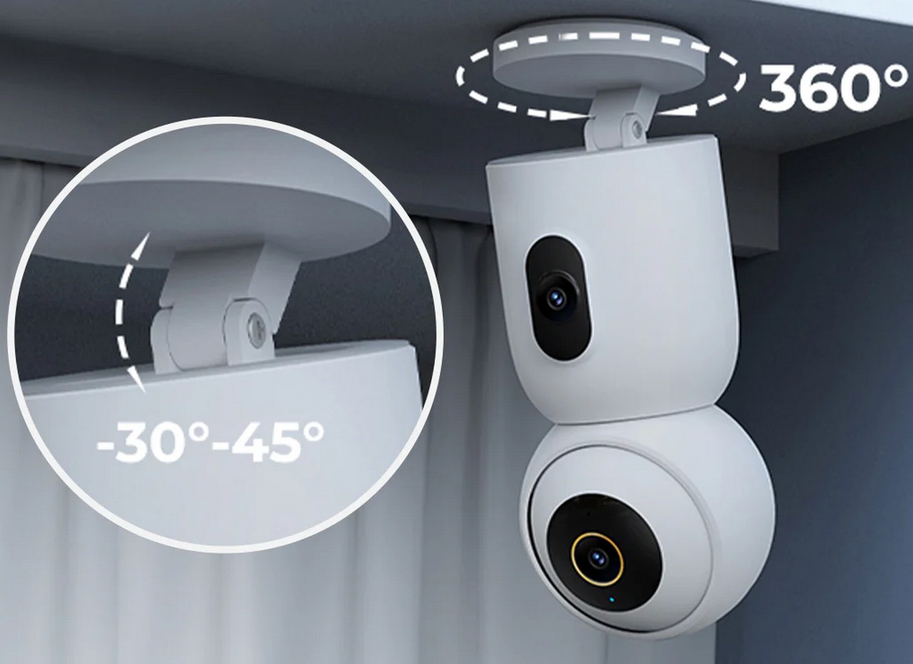 IMILAB C30 Dual — это инновационная внутренняя камера с двумя объективами, разработанная для облегчения ухода за детьми и домашними животными. Она обеспечивает до двух потоков видеонаблюдения в разрешении 3K, круговой обзор на 360° и локальное AI-обнаружение людей, домашних животных, плача ребёнка, посторонних звуков, а также дыма и огня.