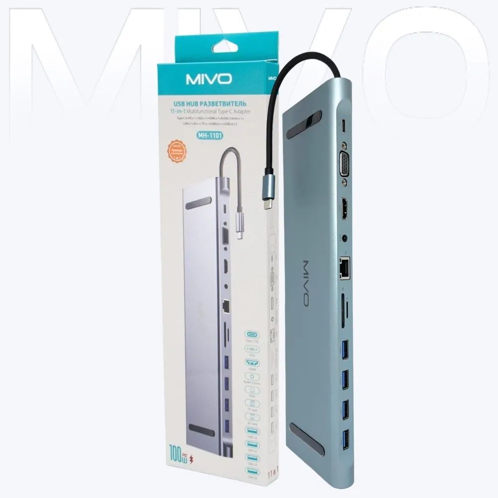 USB концентратор Type-C Multi Adapter 11в1 Mivo MH-1101Разветвитель 11в1 для компьютера Mivo MH-1101 позволяет значительно расширить функциональные возможности ноутбука. Модель оснащена четырьмя разъемами USB, разъемами Type-C, Micro SD, TF, LAN, VGA, Audio 3.5 mm и HDMI которые расположены на боковой стороне корпуса. Адаптер используется для подключения дополнительного оборудования, в том числе смартфонов, фотоаппаратов, накопителей или клавиатуры. Изделие изготовлено из высокопрочного пластика и алюминиевого сплава, устойчивого к механическому воздействию и надолго сохраняющего первоначальный вид. Разветвитель обеспечивает быструю и бесперебойную передачу данных. Для работы устройства не требуется дополнительное питание, а установка драйверов осуществляется автоматически.