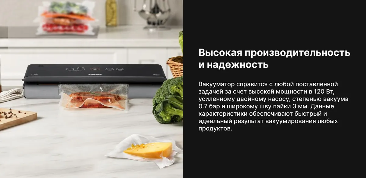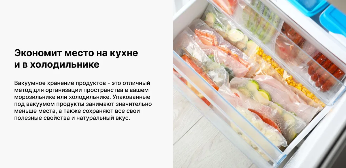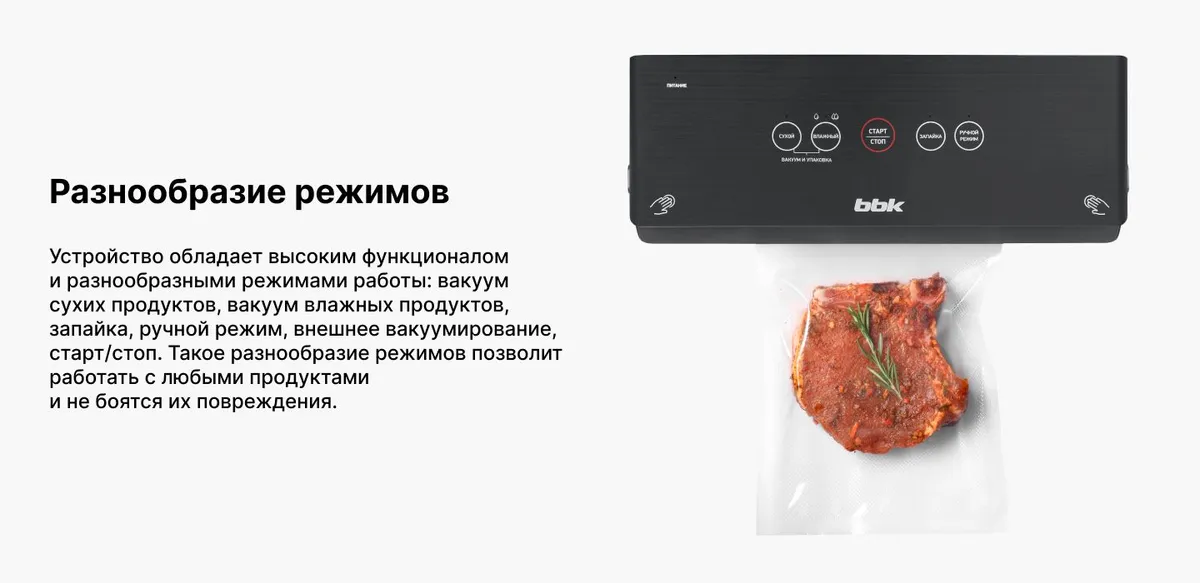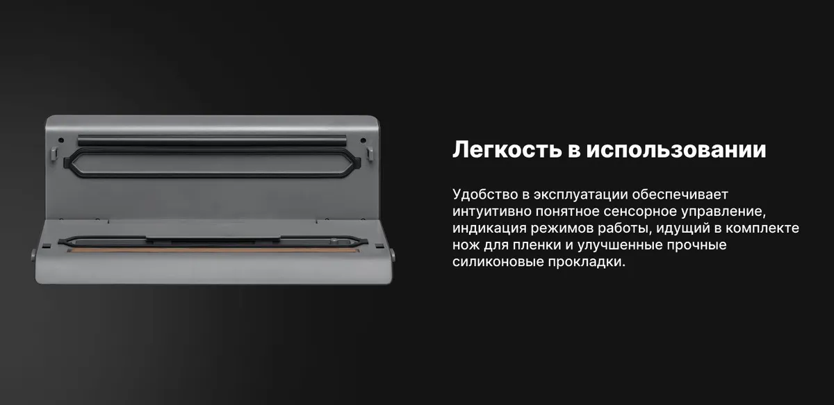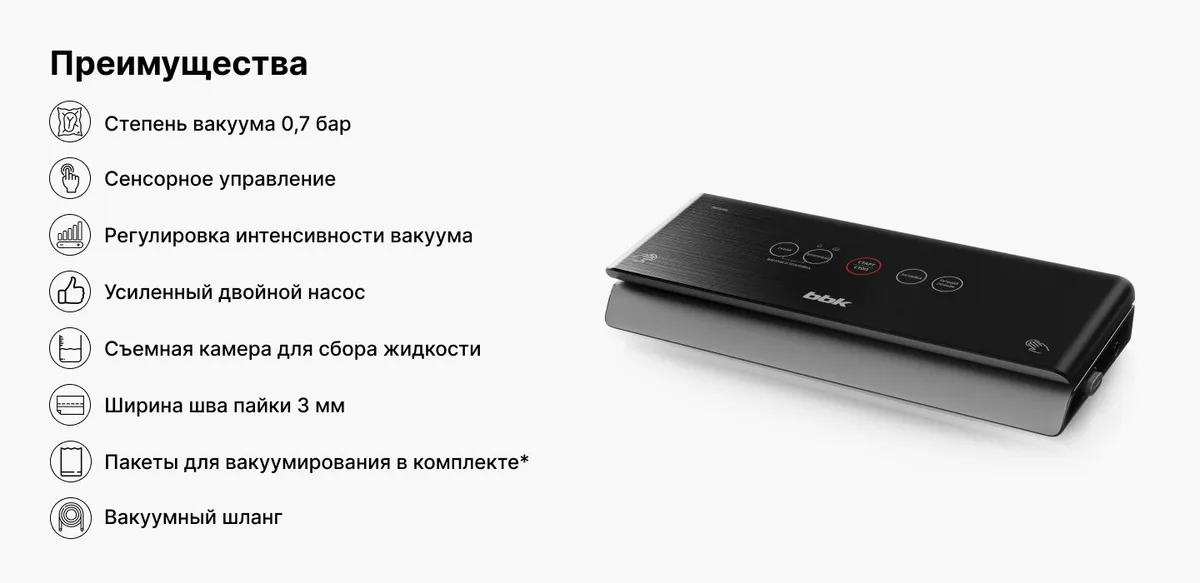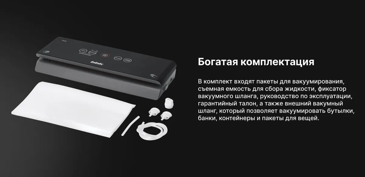 Вакуумный упаковщик, съемная емкость для сбора жидкости, пакеты для вакуумирования - 1 компл., вакуумный шланг, фиксатор вакуумного шланга, руководство по эксплуатации, гарантийный талон