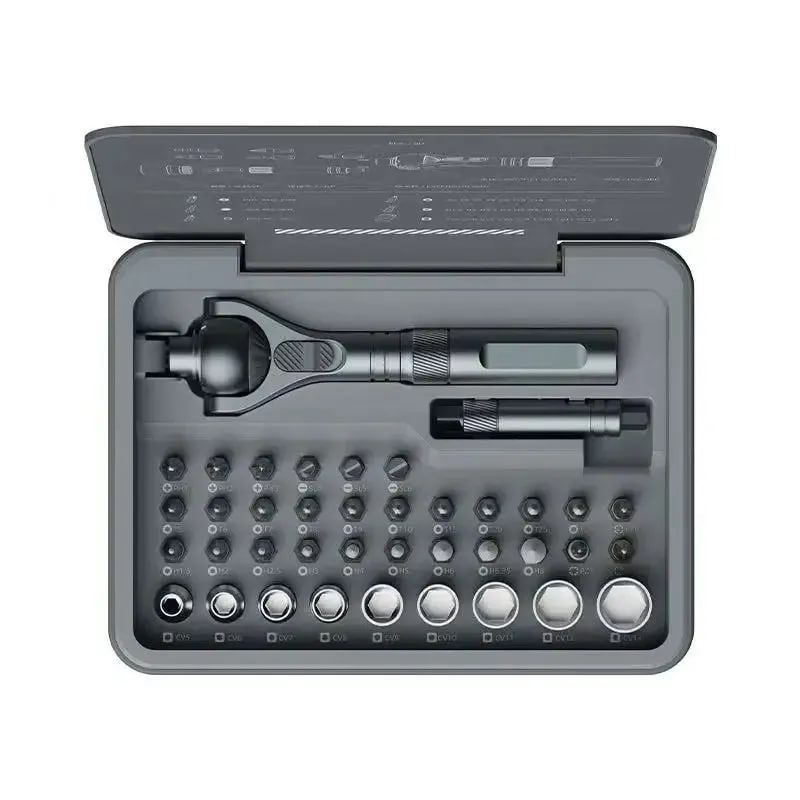 Набор инструментов Xiaomi ATuMan Duka RS-2 33 in 1 состоит из 22 бит, трещотки с переключателем направления вращения, 9 головок (3-12 см), удлинителя трещотки и кейса из пластика для хранения. Насадки выполнены из легированной хром-молибденовой стали.