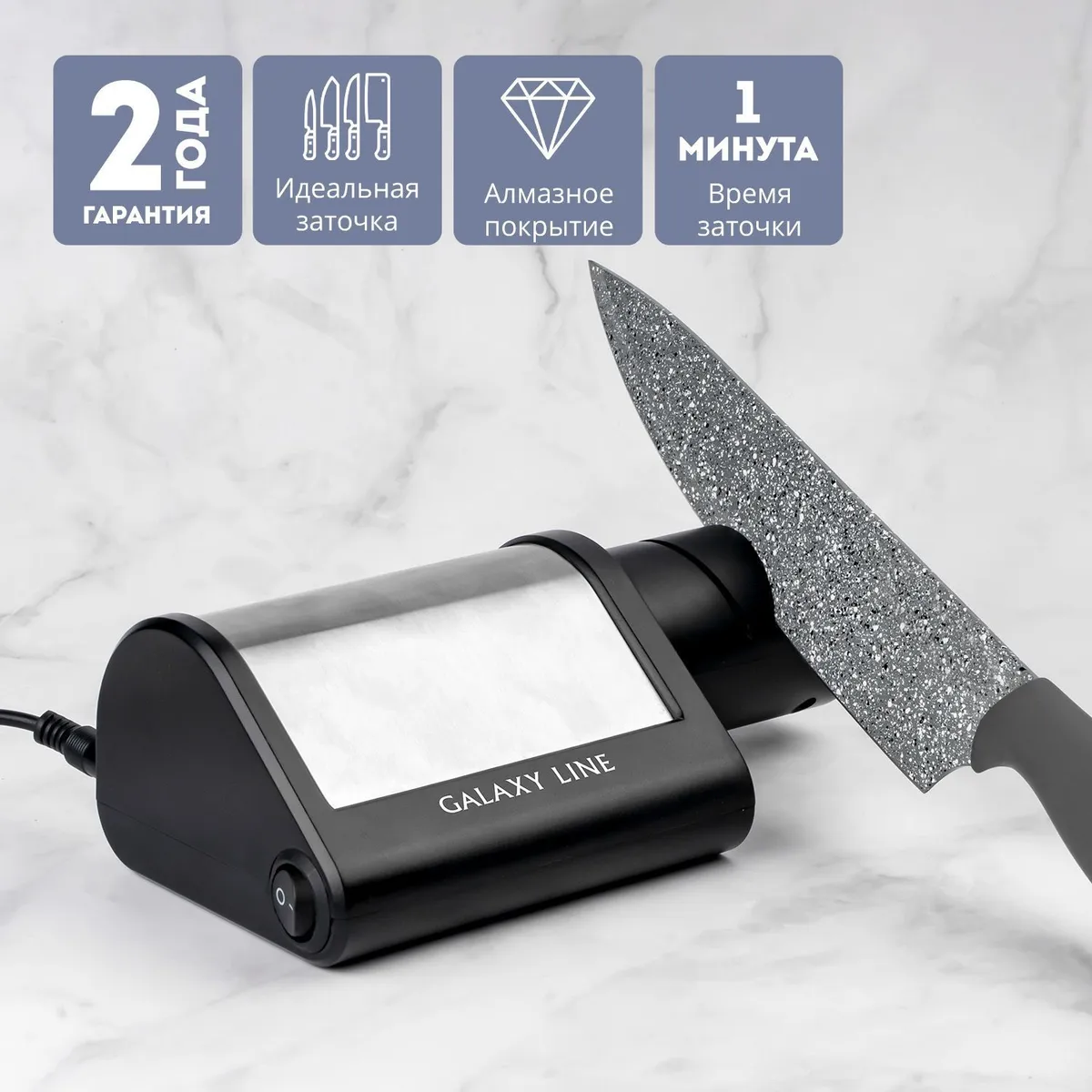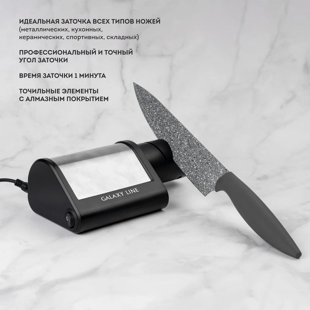 Электрическая точилка для ножей GALAXY LINE GL2443Электрическая точилка для ножей GALAXY LINE GL2443 обеспечивает идеальную заточку всех типов ножей: металлических, кухонных, керамических, спортивных, складных. Высокоэффективные точильные элементы с алмазным покрытием обеспечивают качественную заточку даже таких деликатных типов ножей, как керамические. Профессиональный и точный угол заточки, позволяет добиться идеального результата в домашних условиях, и не требует специальных навыков и опыта заточки.Комплектация