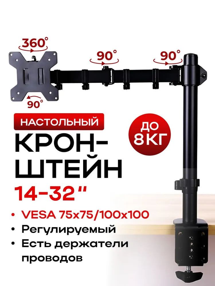 Кронштейн для монитора совместим со стандартом VESA 75х75 мм, 100х100 мм, что делает его универсальным решением для большинства современных мониторов. Так как, этот кронштейн может использоваться как настольное крепление для монитора, что позволяет экономить пространство на рабочем столе.