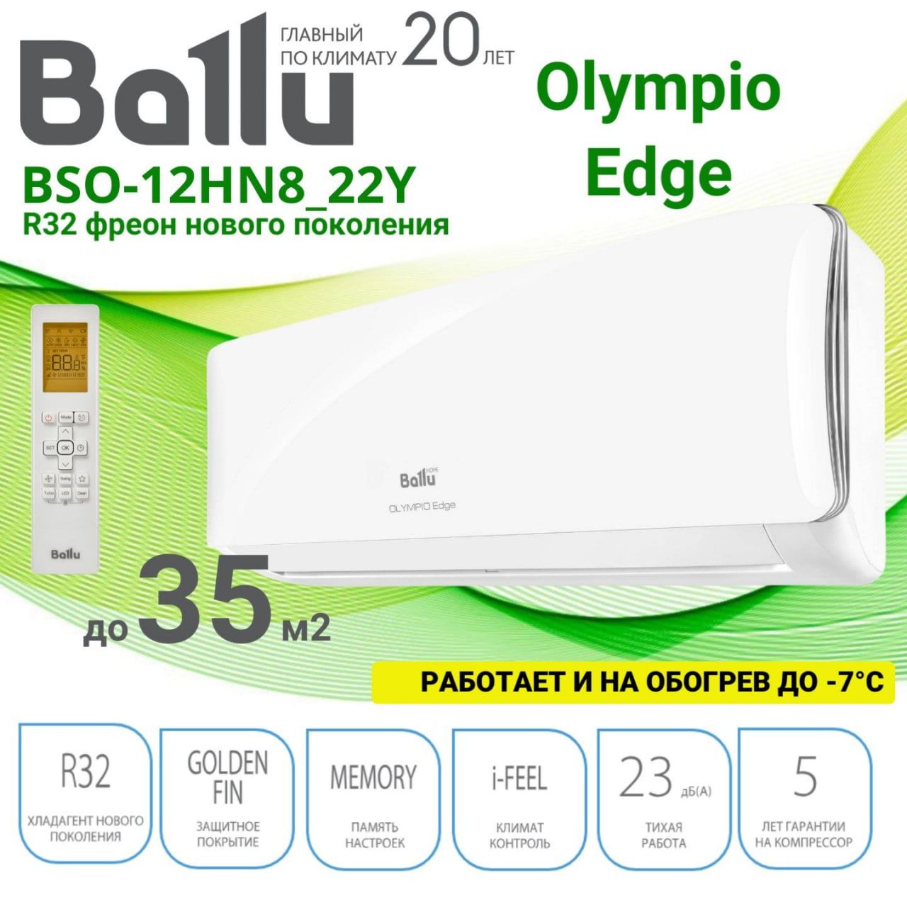 Сплит-система Ballu Olympio Edge BSO-12HN8_22YЭто современное решение для создания комфортного микроклимата в помещении площадью до 35 квадратных метров. Модель сочетает стильный дизайн, высокую энергоэффективность класса A , и множество полезных функций, что делает её идеальным выбором для дома или офиса.