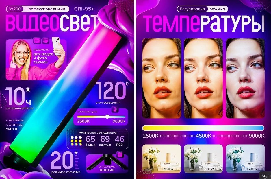 Видеосвет цветной W200 RGB от Loonix – это идеальное решение для освещения при фото- и видеосъемке. Компактная и легкая LED лампа обеспечивает мощный и равномерный свет, что позволит вам создавать высококачественные кадры в любых условиях. В комплекте идет удобный штатив, который обеспечивает стабильность и мобильность, позволяя настроить лампу в нужное положение для достижения оптимального освещения. Благодаря RGB-функции, вы можете выбирать из множества цветовых настроек, что открывает широкие возможности для творческих экспериментов и создания уникальных световых эффектов. Эта лампа станет незаменимым аксессуаром для всех, кто занимается фотографией или видеосъемкой, будь то профессионал или любитель. Лампа также настолько универсальна, что легко интегрируется в ваш домашний офис для проведения вебинаров или видеоконференций, улучшая качество изображения во время онлайн-звонков. Ваша лампа кольцевая станет верным помощником в создании контента для социальных сетей, блогов или YouTube-канала. Эффективный и мощный светодиодный источник света отлично подходит для съемок в помещении и на улице, а простота сборки и эксплуатации делает эту кольцевую лампу идеальным выбором для начинающих пользователей. Видеосвет со штативом обладает не только высокой функциональностью, но и современным дизайном, который впишется в любое рабочее пространство. Независимо от того, снимаете ли вы портрет, записываете видеоурок или снимаете продуктовую фотографию, свет для фото и видео W200 RGB обеспечит вам идеальное освещение. Удобное управление яркостью и цветом делает этот осветитель идеальным инструментом для достижения профессиональных стандартов освещения. Опытные фотографы оценят гибкость настроек, а начинающие будут приятно удивлены простотой использования. Если вы ищете надежный и качественный свет для вашего телефона, то эта мини лампа на штативе станет вашим лучшим выбором.