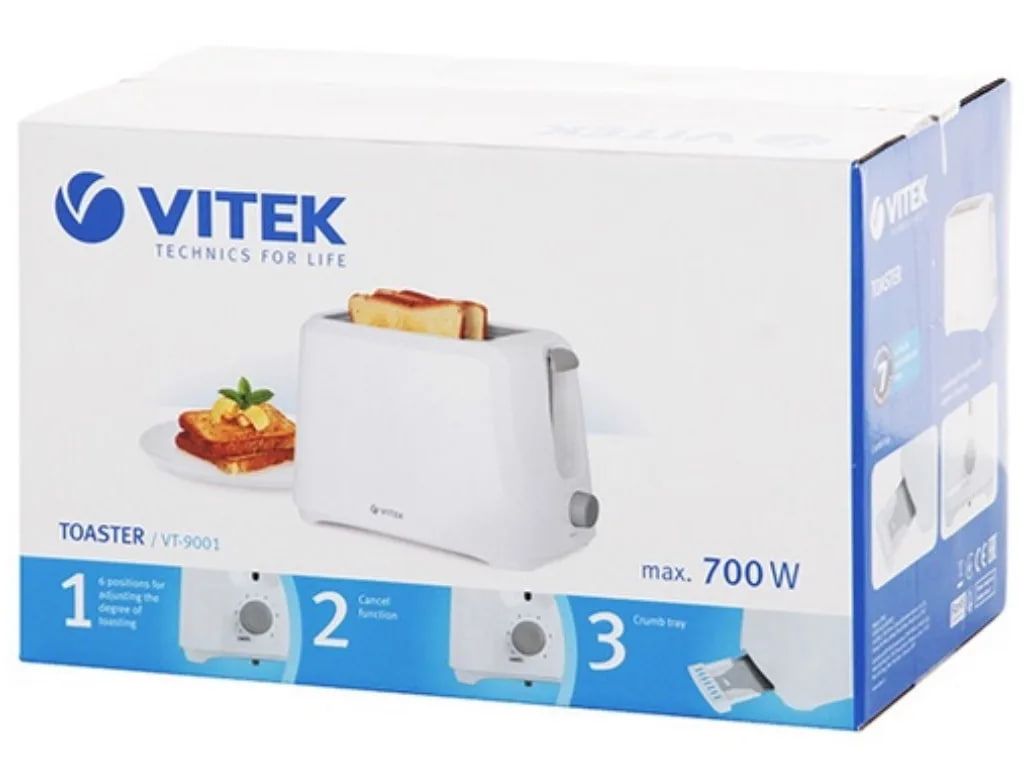Основные характеристики Бренд VITEK Цвет товара белый Мощность 700 Вт Количество отделений 2 Количество тостов 2 Тип управления механическое Дополнительные характеристики Особенности отсек для шнура, термоизолированный корпус Дополнительные функции кнопка отмены, регулировка степени обжаривания Дополнительные режимы автоматическое поднятие тостов, регулировка степени обжаривания В комплекте поддон для крошек Материал корпуса пластик Длина сетевого шнура 60 см Высота 17.3 см Ширина 26.5 см Глубина 15.3 см Вес 0.91 кг Дополнительная информация экстра-подъем тостов
