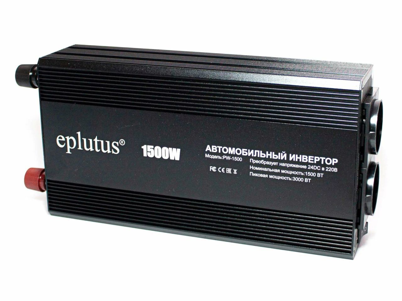 Инвертор автомобильный PW-1500 от ТМ Eplutus имеет выходную мощность 1500 Вт и рассчитан на использование в дальних поездках, когда отсутствует возможность доступа пользователя к бытовой электросети. Посредством кольцевых клемм Eplutus PW-1500 подключается к контактам автомобильного аккумулятора (24 В постоянного тока), генерируя на выходе напряжение 220 В 50 Гц.