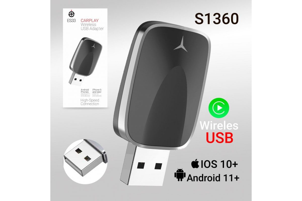 Этот беспроводной USB-адаптер ES33 предназначен для преобразования штатного проводного Apple CarPlay или Android Auto в беспроводное подключение. Он позволяет использовать функции смартфона, такие как навигация, музыка и звонки, без необходимости подключения кабеля к автомобилю.