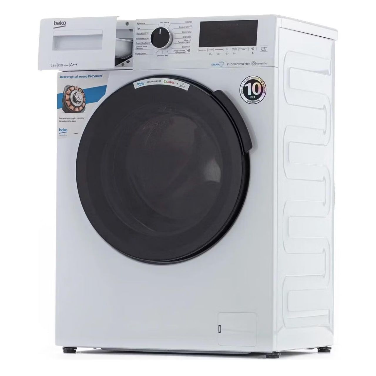 Стиральная машина Beko WSPE7H616W соответствует классу энергопотребления А. Это позволяет модели не только заботиться об окружающей среде, но и сократить расход ценных ресурсов. Прибор с размерами корпуса 84x60x49 см использует элемент нагрева Hi-Tech, который, благодаря наличию никелированного покрытия, способен защитить внутренние элементы от возникновения ржавчины и накипи. Такой элемент позволит не использовать средства для смягчения воды в процессе стирки, увеличивая и срок ее службы. С технологией HomeWhiz вы сможете управлять работой машины дистанционно. Для этого нужно воспользоваться специальным приложением, предварительно установив его планшет или смартфон. Через приложение вы можете следить за временем, включать и отключать устройство, ставить цикл стирки на паузу. Beko WSPE7H616W поддерживает 15 программ стирки, что позволяет адаптировать машину для разных видов ткани, получая в итоге качественный результат. Преимущество модели кроется в использовании технологии обработки паром SteamCure как перед началом, так и после завершения стирки. Благодаря воздействию паром на ткани загрязнения на них размягчаются, что обеспечивает более легкое отстирывание пятен от красок, травы или сладостей. В конце цикла подача пара позволяет уменьшить число складок.